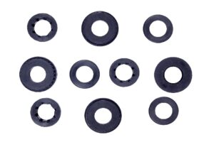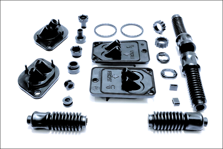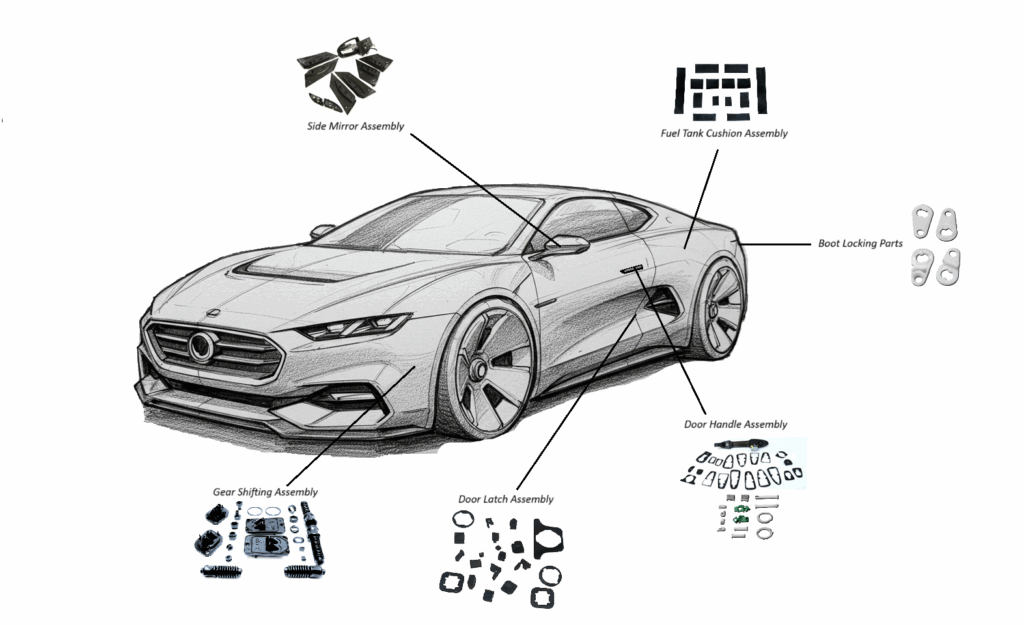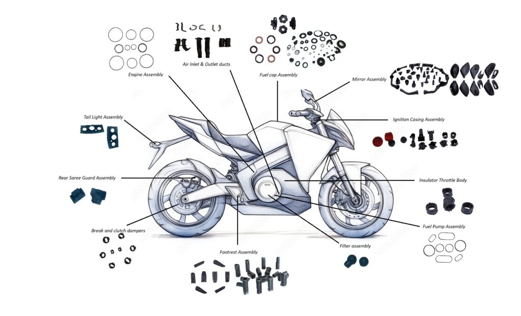 All 2 Wheeler Sub Assemblies 4 Wheeler Sub Assemblies Commercial Vehicle Sub Assemblies Type 2 FKM (Viton) Fuel Pump Gaskets Type 1 FKM (Viton) Fuel Cap Parts Oil/Fuel Resistant Engine parts 2 Wheeler Foot-rests Medical- Hospital Bed parts Metal Bonded Rubber Parts & Mountings 2 wheeler Side mirror Boots Miscellaneous gromets and O-Rings 2 Wheeler Inlet & Outlet Tubes 2 Wheeler Fuel seal parts 4 Wheeler Door handle parts 4 wheel mirror pads Commercial vehicle rubber pads Shocker system parts 2 Wheeler Axle hubs and dust covers Railways Airbrakes gaskets Motor/ pump Mountings 4 Wheeler Gear Shift Parts 4 Wheeler Fuel Tank Adhesive Pads
